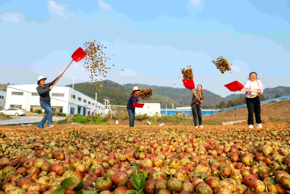 初冬時(shí)節(jié),貴州省黔東南苗族侗族自治州從江縣種植的油茶果迎來(lái)全面收獲期,村民們搶抓晴好天氣晾曬油茶果,鄉(xiāng)村呈現(xiàn)一派繁忙景象。11月12日,貴州省從江縣丙梅街道居民在晾曬油茶果(無(wú)人機(jī)照片)。目前,該縣油茶種植面積累計(jì)達(dá)17.16萬(wàn)畝,掛果面積8.23萬(wàn)畝,今年預(yù)計(jì)產(chǎn)茶籽產(chǎn)量約8200噸,產(chǎn)值約1.2億元。